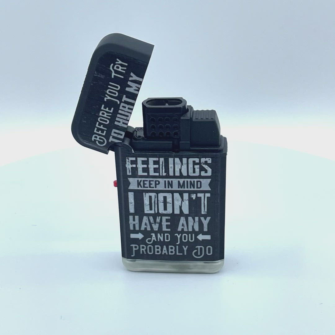Tactical Dual Torch Lighters feature a 2300° blue flame, perfect for camping, cigars, pipes, and candles. Also has an extra large, refillable fluid chamber – you won't have to worry about this torch going out! Satirical phrase styles printed on soft touch comfort casing.