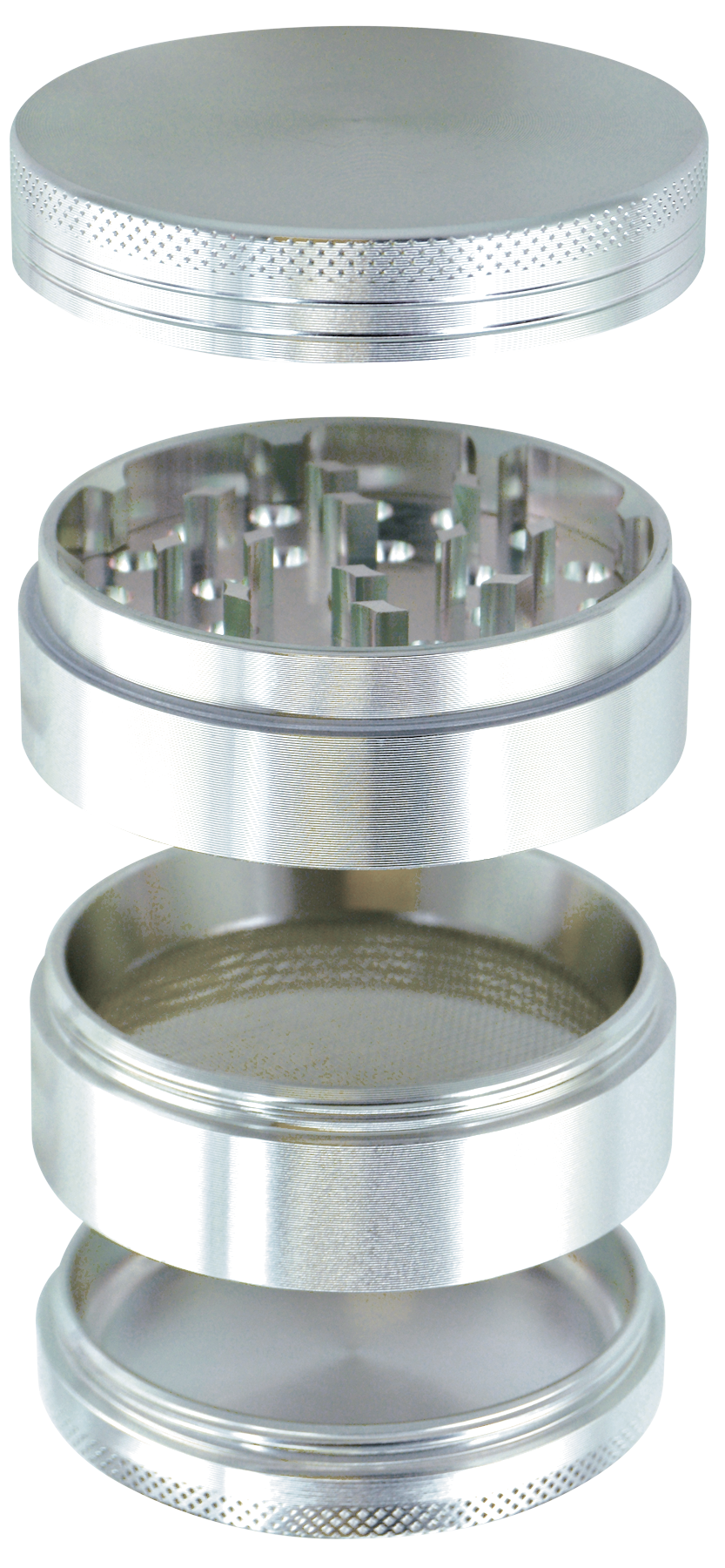 63 MM 4 piece grinder. Comes in a classic silver color. Made from durable, lightweight aircraft grade aluminum. Has fine metal screen and includes scraper tool. Assortment varies.