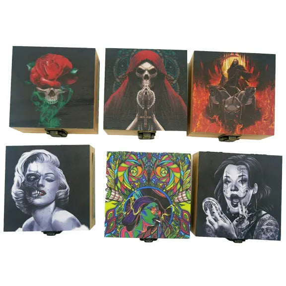 Wood treasure box for keeping items safe and secure. Made from durable pine material with metal latching lock. Assorted artistic designs included in each display.
