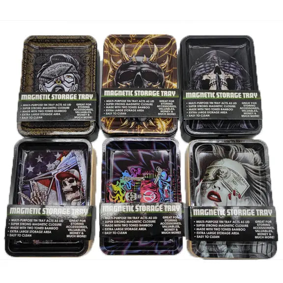 Magnetic Storage Tray is ideal for keeping items safe and secure. Made from durable pine material. Easy to clean. Features removable multi-use tray! Each display includes assorted designs, including three(3) new black wood styles.