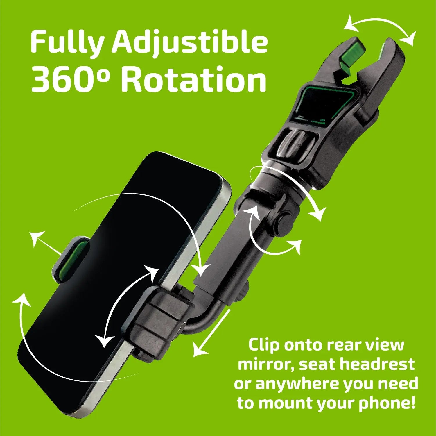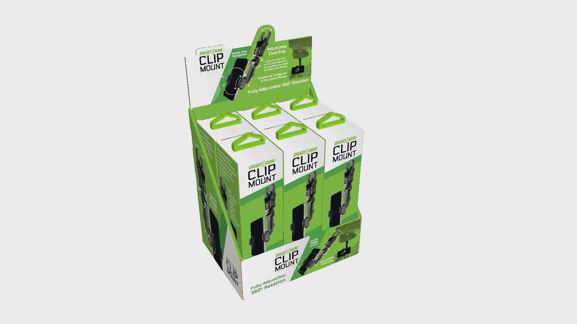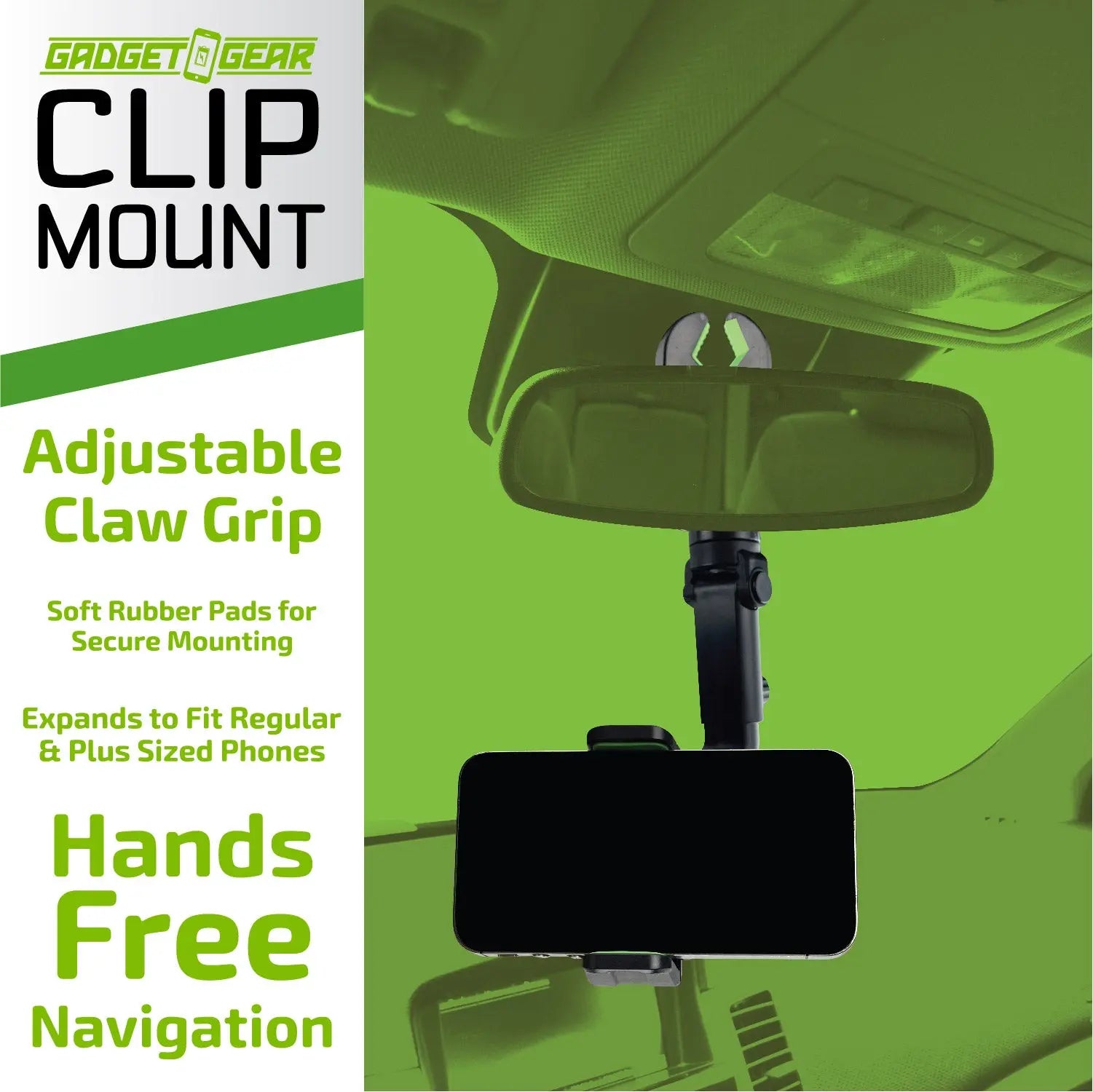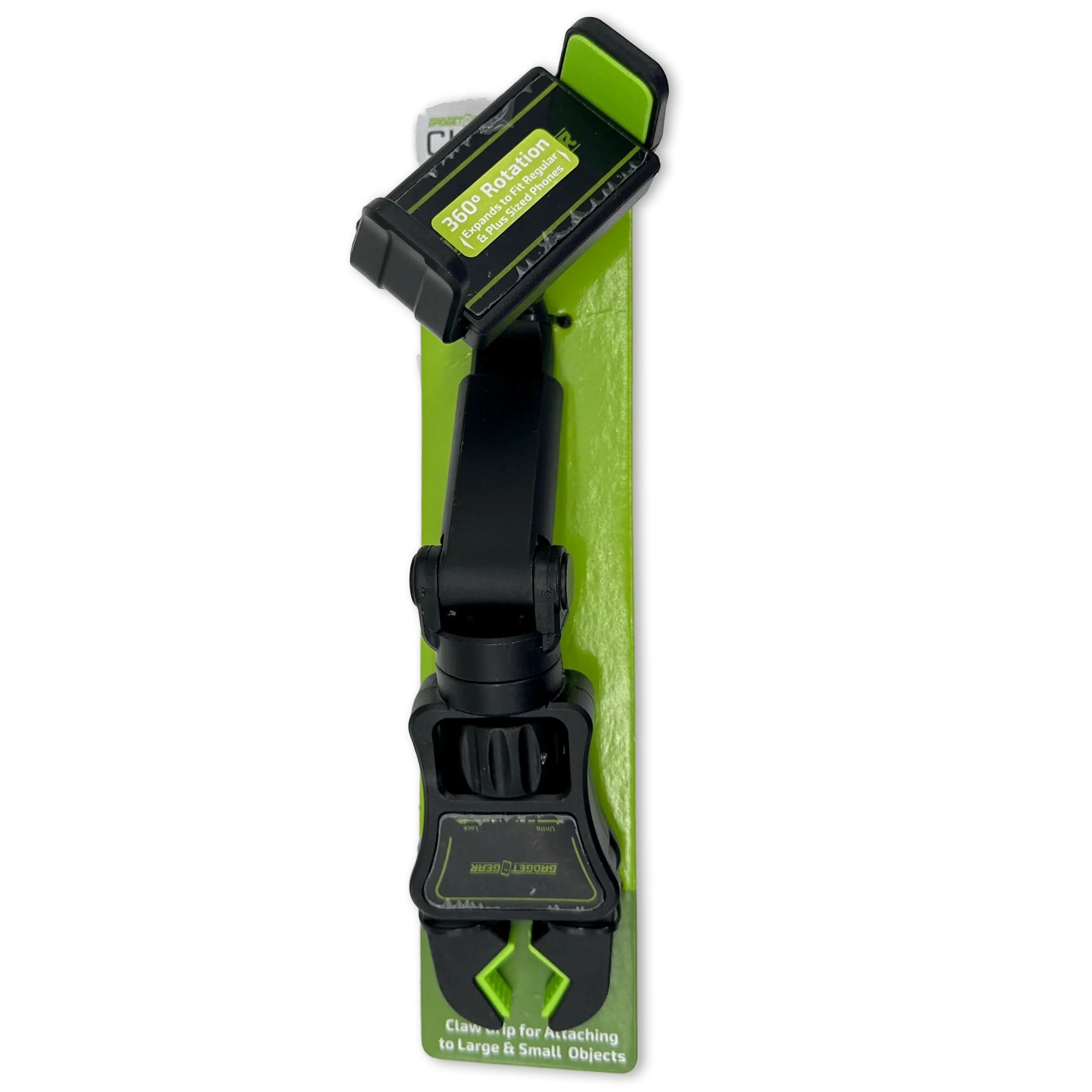 This Gadget Gear Adjustable Claw Grip expands to fit regular and plus sized phones. Hand free navigation! Soft rubber pads for secure mounting. Fully adjustable 360º rotation. Clip onto mirror, seat headrest or anywhere you need to mount your phone!