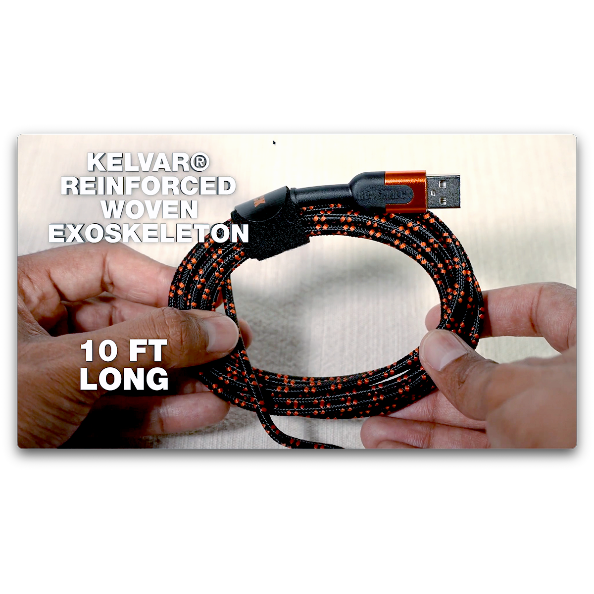 This 10FT 3 IN 1 CABLE provides convenient, multi-device charging with its 3 different cords: lightening, USB Type-C and micro-USB. Constructed with heavy-duty braided nylon and a protective aluminum casing, this ultra-durable cable is made with the same material used to make bullet proof vests. With a 10ft length, you'll never be too far from an outlet and will easily be able to reach the backseat. Experience rapid charge with a 2.4A SYNC & Charge!