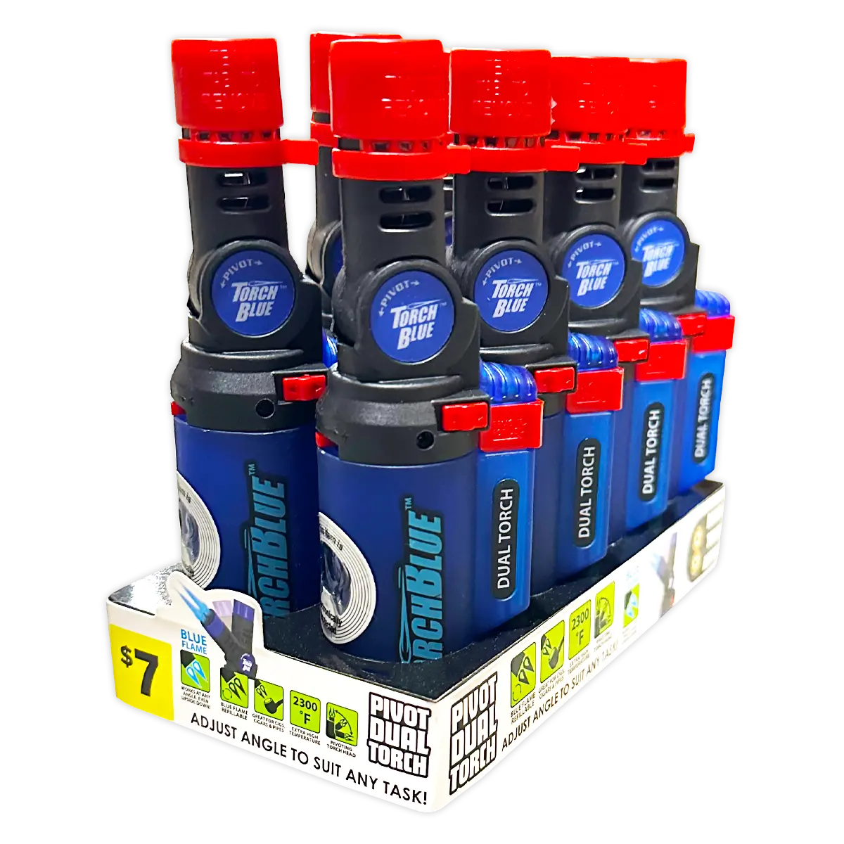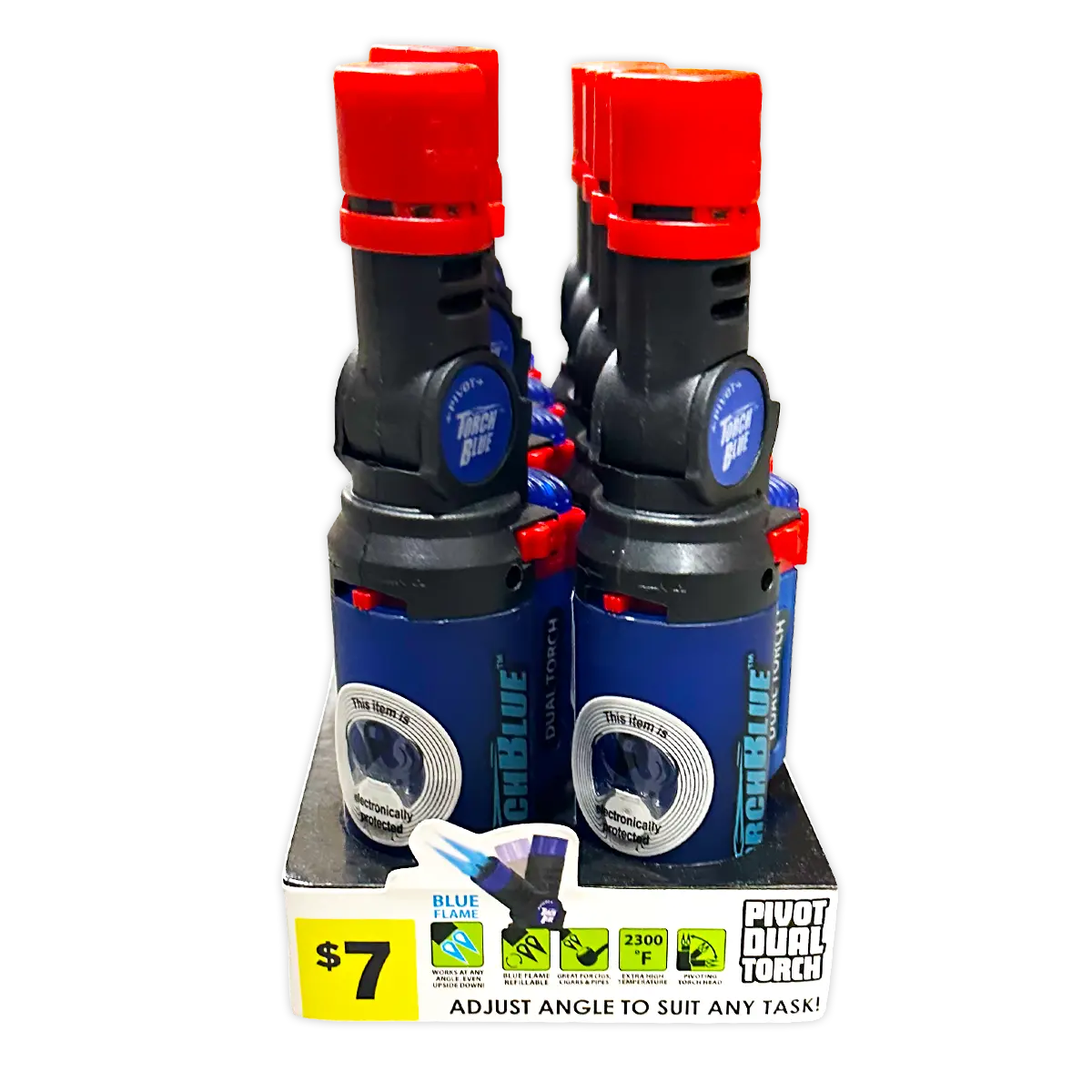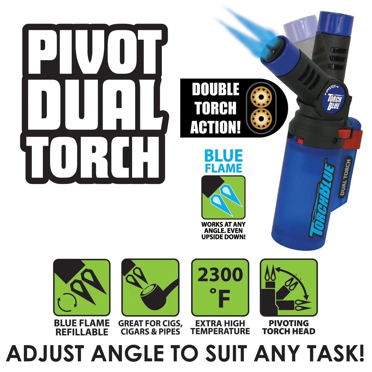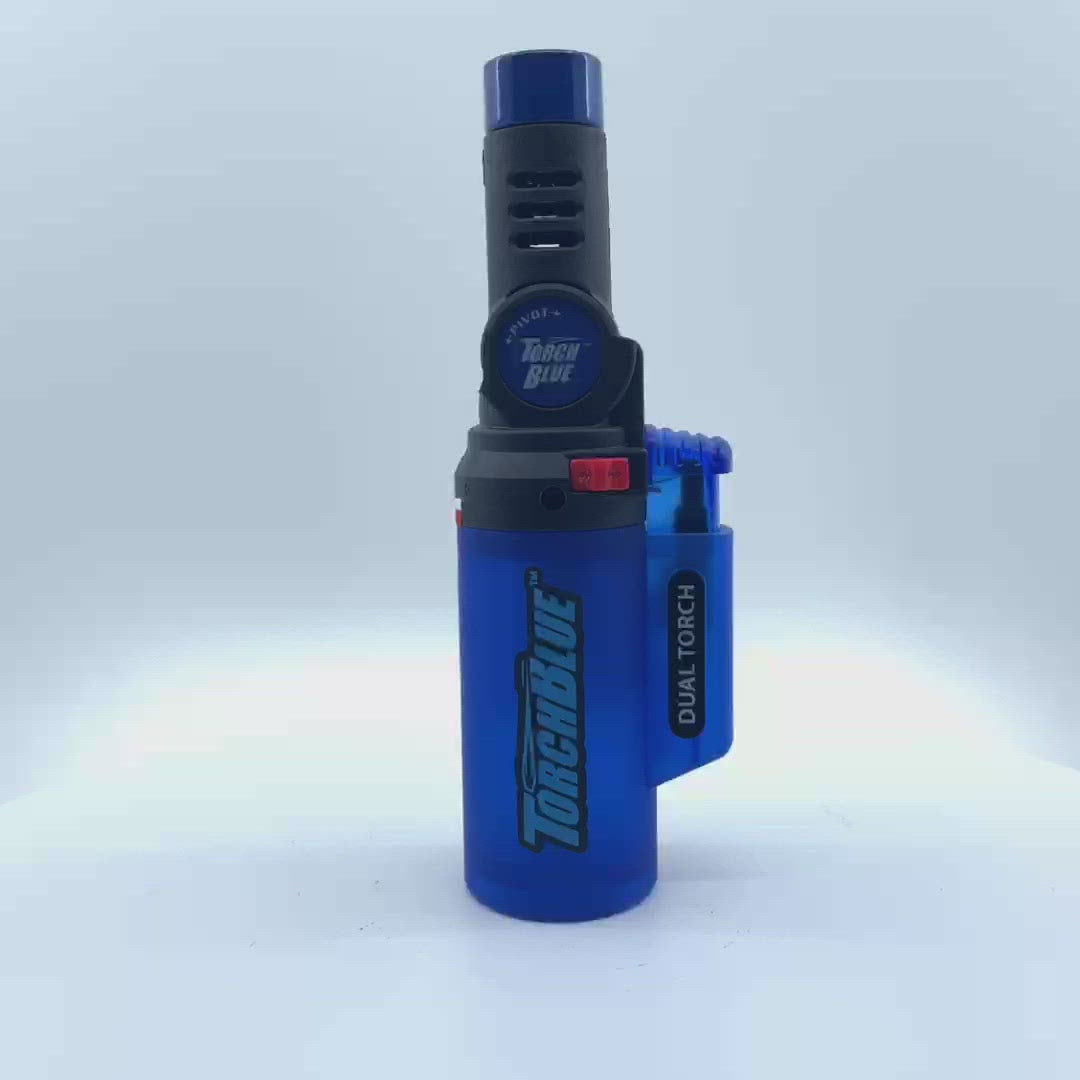 Torch Blue pivoting dual torch head can adjust to any angle to suit any task, even upside down! These high power torch flames are 2300°, more than enough for any task. Great for camping, bronzing metal, soldering wires, flaming food, and more! Comes with a built-in safety lock. Features a soft touch finish.