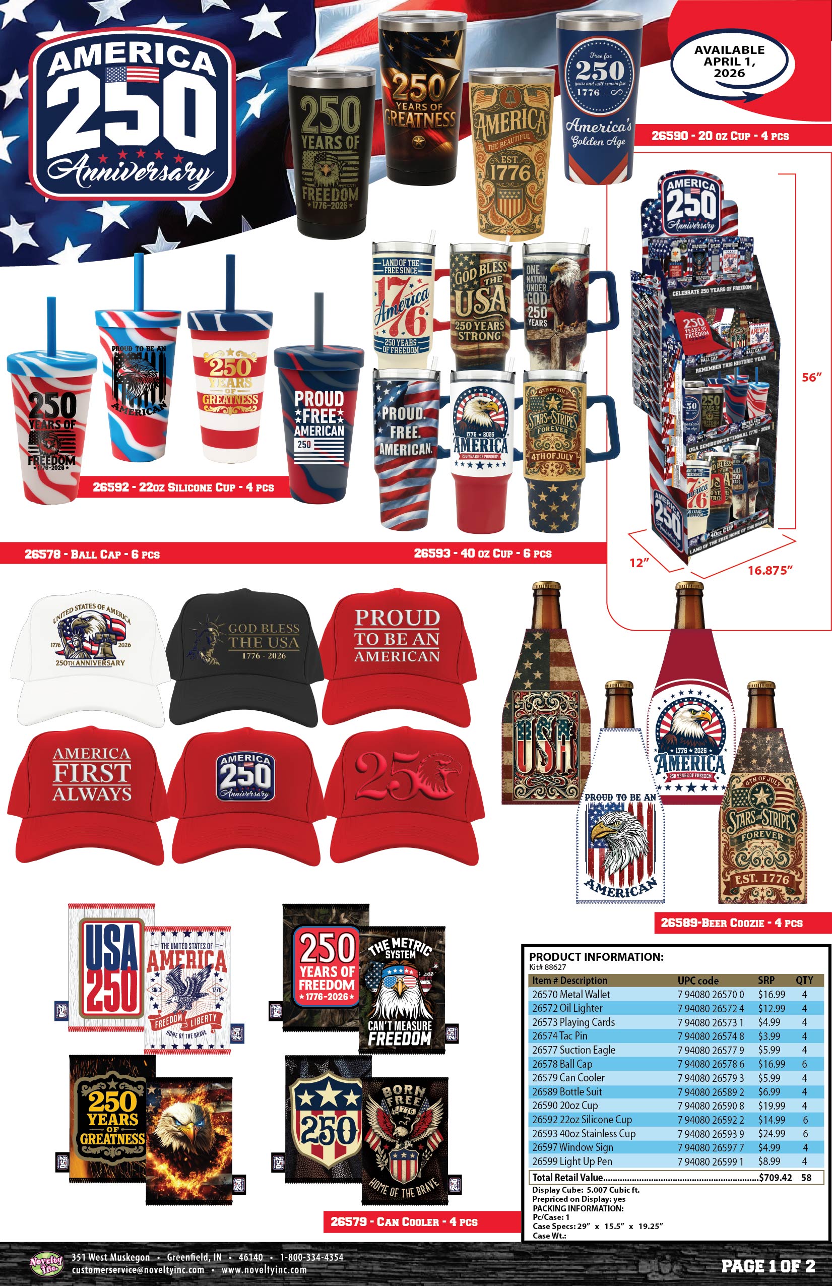 Commemorate America's milestone with this striking USA 250 Floor Display—a retail-ready solution designed to capture customer attention and drive seasonal sales. Each kit includes patriotic product merchandised for immediate shelf placement, eliminating extensive setup time and maximizing floor impact. Perfect for retailers celebrating the nation's 250th anniversary, this display combines patriotic appeal with practical merchandising efficiency. Ideal for convenience stores, gift shops, and general retailers seeking turnkey promotional solutions that resonate with customers during this historic moment.