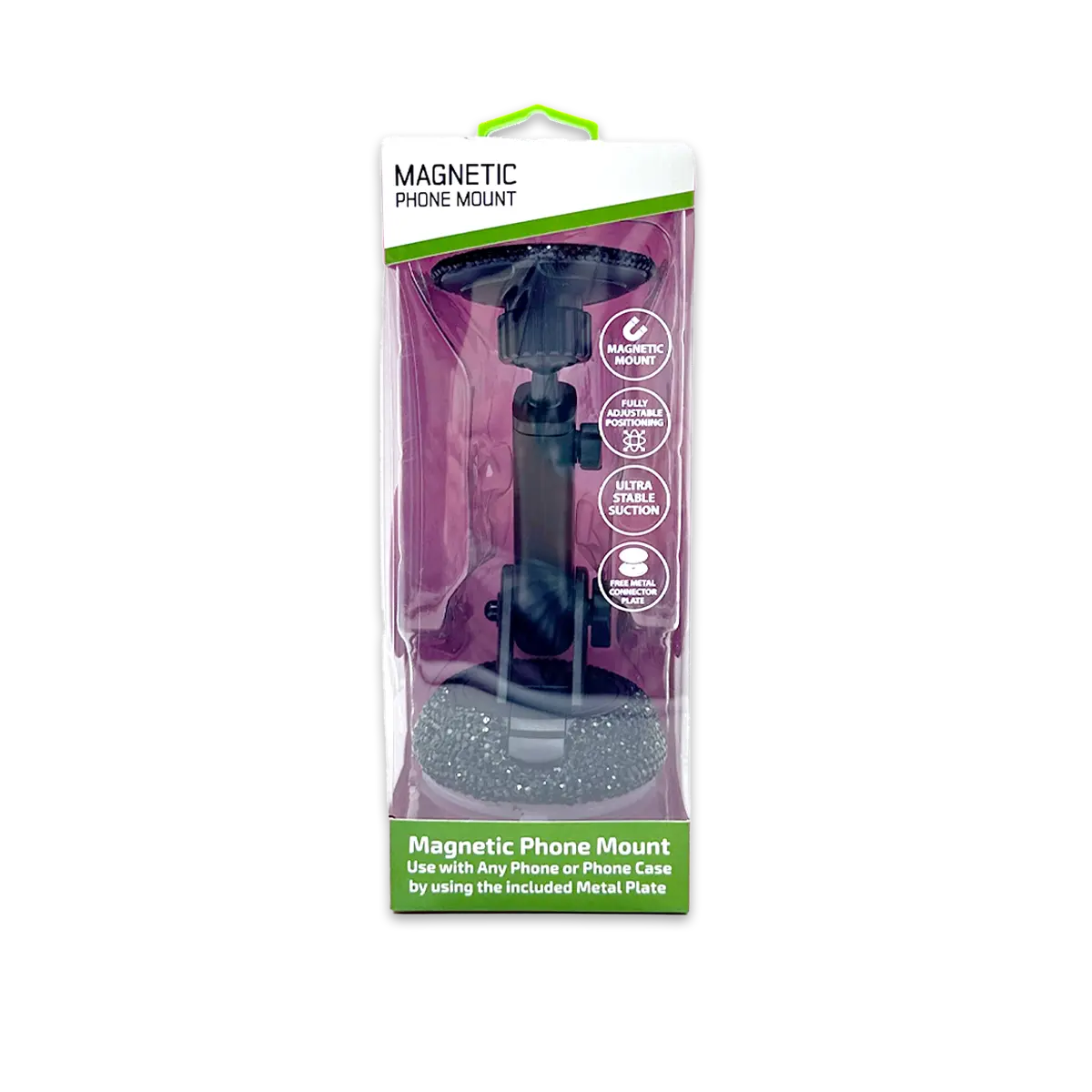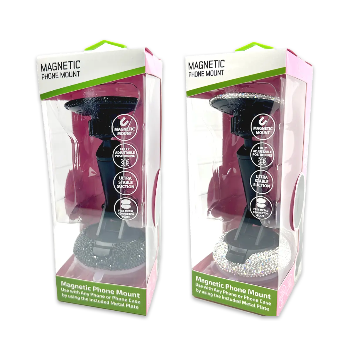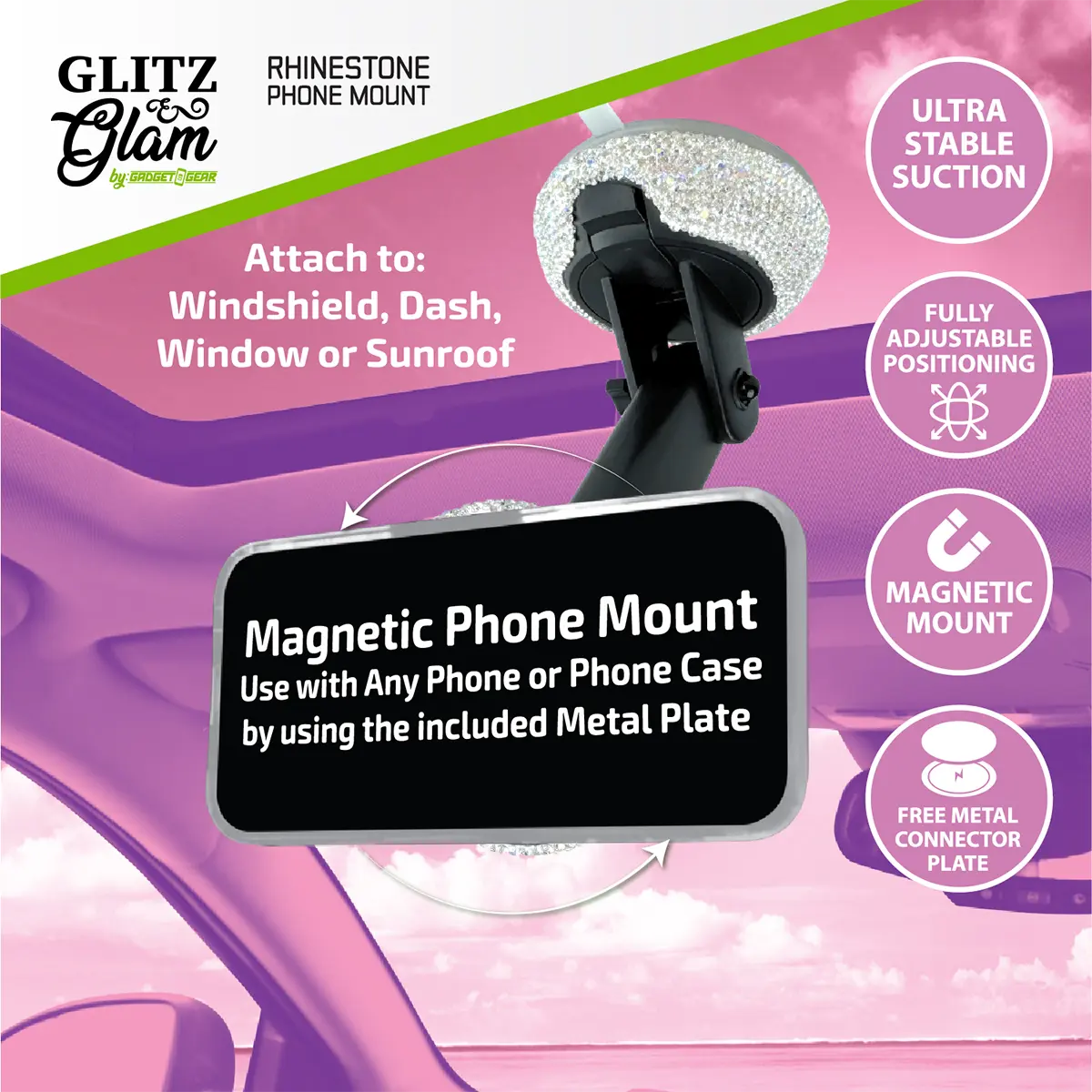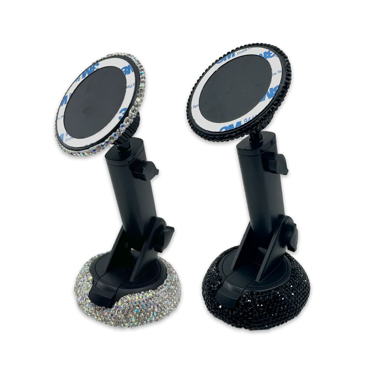 Upgrade your phone's style and functionality with our Rhinestone Phone Mount! Attach it to your windshield, dash, window, or sunroof and enjoy ultra stable suction and fully adjustable positioning. No need to worry about compatibility - our magnetic mount can be used with any phone, thanks to the included metal plate. Plus, the padded clamp ensures your phone stays secure.