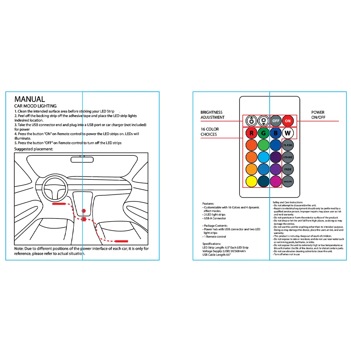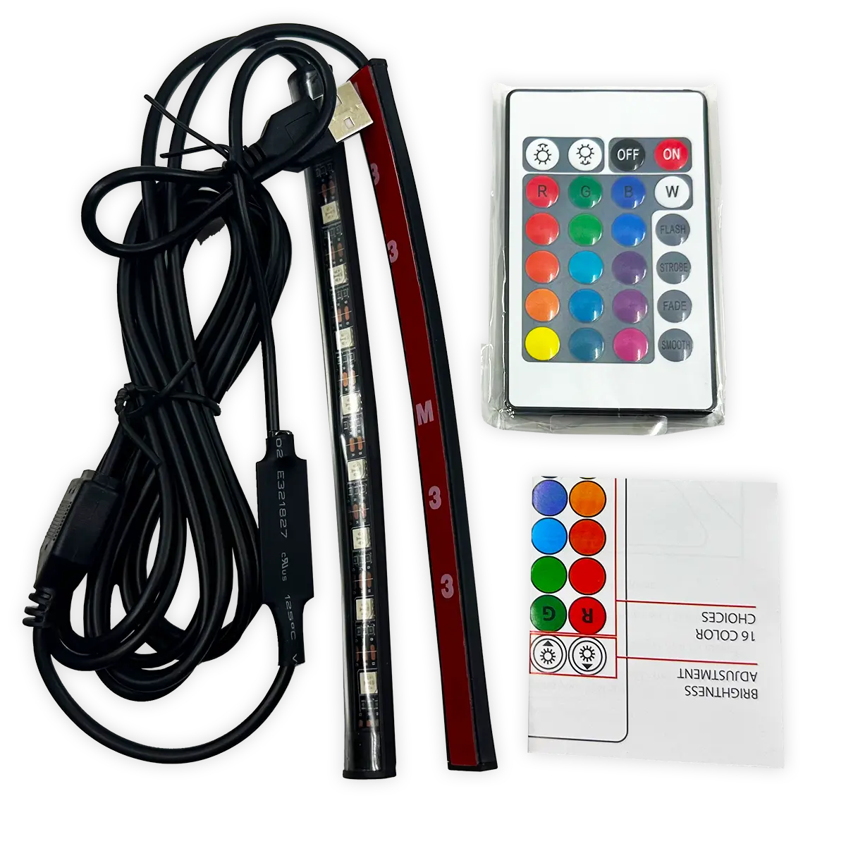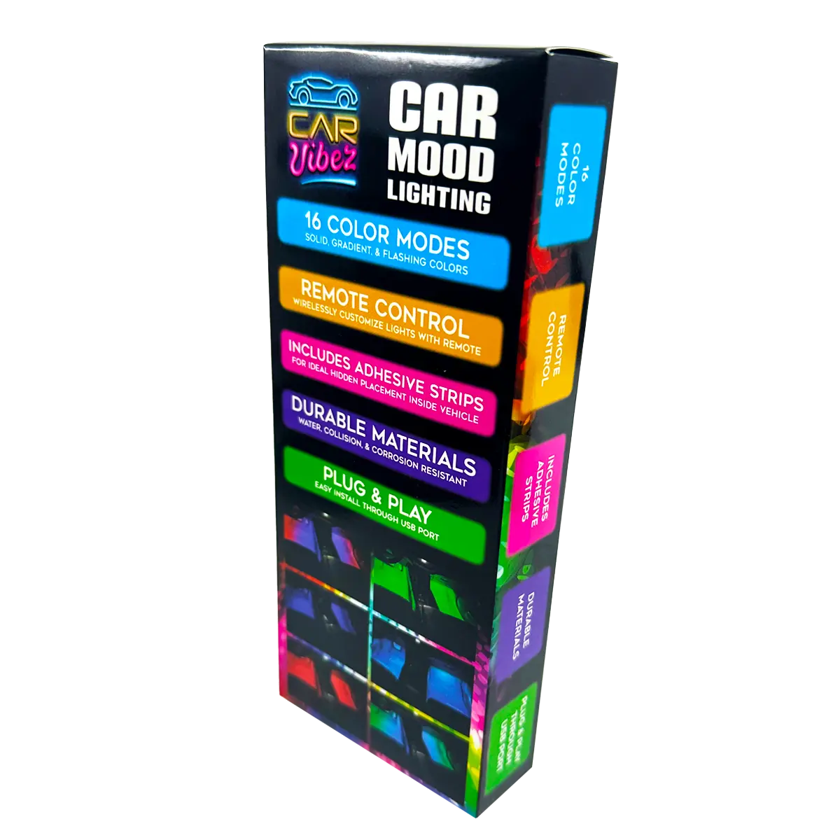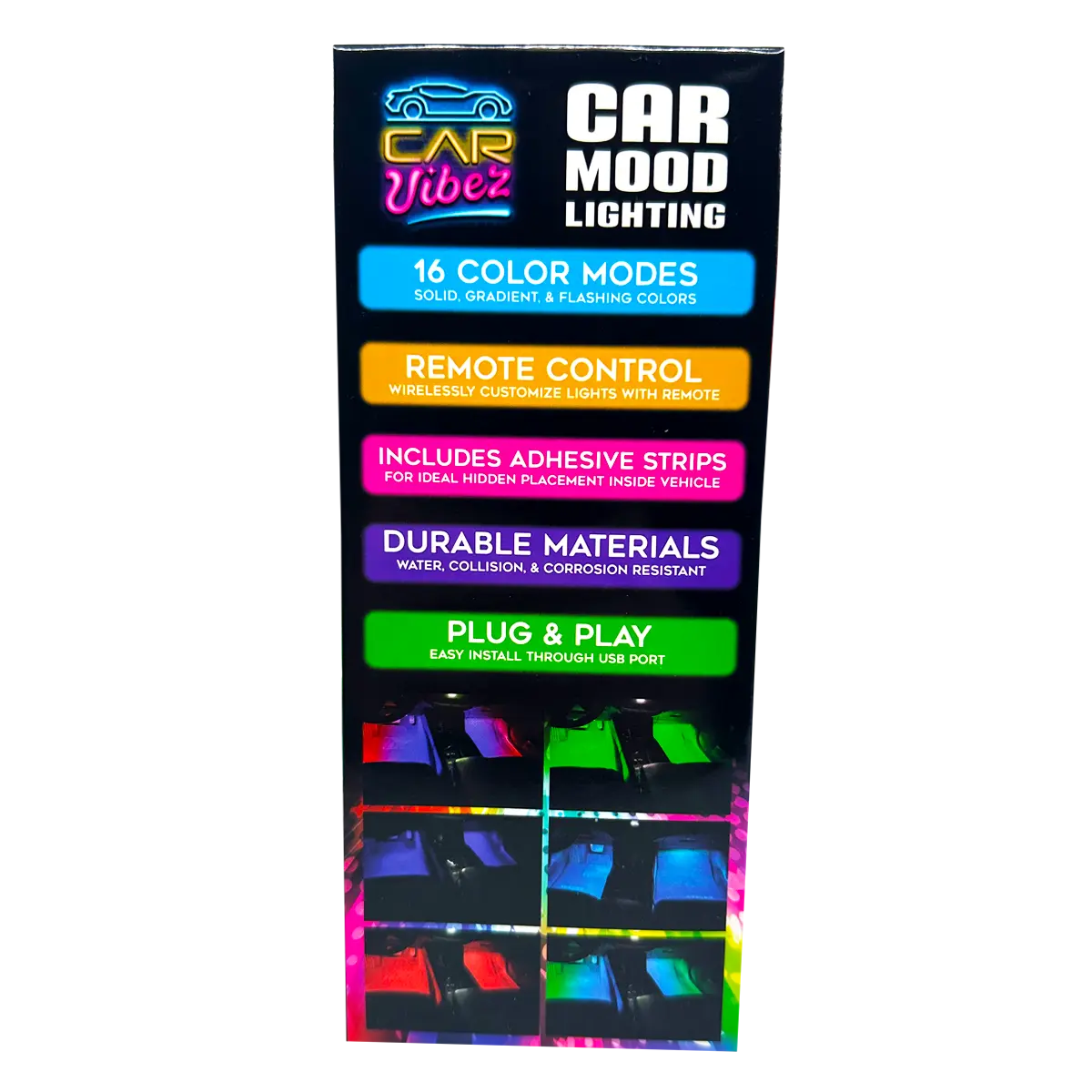 Show off your style with our Car Vibez Mood Lighting! Easy to install with double-sided adhesive straps; just plug and play, no modification necessary. With wireless remote control, you'll be able to change colors and adjust brightness to set the perfect vibes in your car, locker, or anywhere else you want! It's the perfect way to show off your mood.