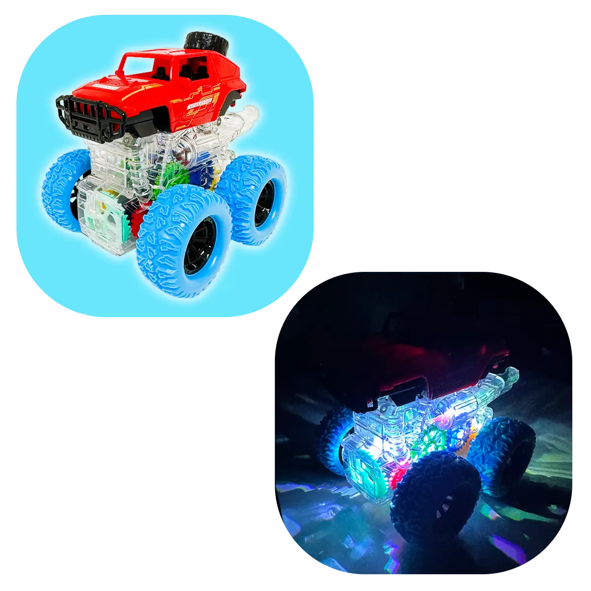 JUMBO Light Up Vehicle Gear Racers feature multicolor light-up action, push and go friction power and 360º stunt spin! Ages 3+. Assorted colors. Batteries included for light-up action! Flip switch on the back to activate lights & sounds. Anti-skid rubber grip wheels – perfect for indoor AND outdoor play.